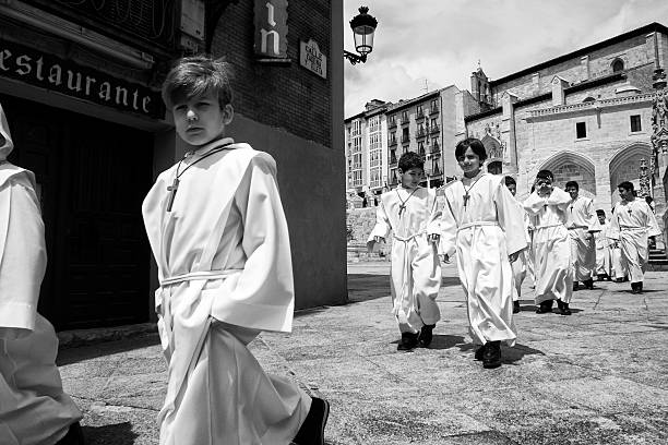 «Burgos, Spain – June 3, 2012: A group of several altar boys walk near the cathedral after a sunday mass.»